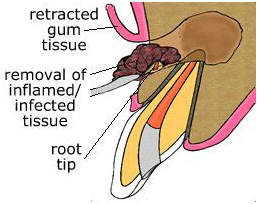 Step one: After the tooth is "numbed", the gum is reflected (lifted) to uncover the underlying bone and the root end of the tooth. The root-end is resected (removed) with all the surrounding infected tissue.