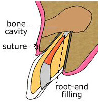 Step two: A root-end filling is placed to seal the end of the root canal, the gum is repositioned, and a few dissolvable sutures (stitches ) are placed to hold the gum tissue back in its place until healing occurs.