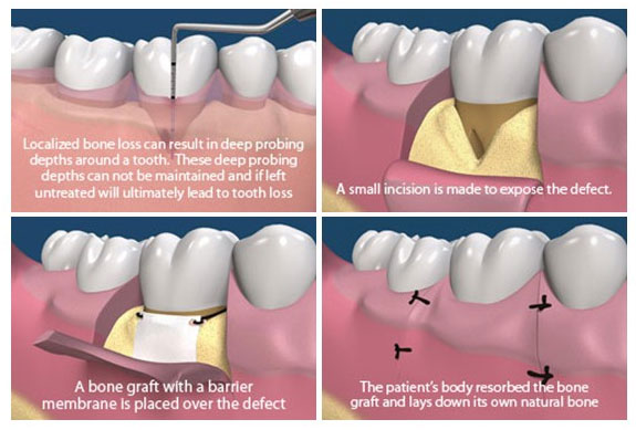 Under local anesthesia a flap ( the gum ) is raised away from the tooth and debrided thoroughly. If necessary a bone graft material is placed into the defect and a membrane is placed over the defect. The gum is sutured back in its original position. This membrane is usually resorbable ( dissolves on its own ). You are instructed to come back for suture removal after a period of 7-10 days.