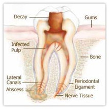 Each tooth has a soft tissue – the pulp which nourishes the tooth. Because of deep decay, injury, or gum disease, the pulp tissue in your tooth has become inflamed or infected. In any other part of your body, if a similar tissue becomes diseased, the body merely throws it off and forms new tissue. However, a tooth is a unique and different. Because the infected soft tissue (pulp) within the tooth is totally encased within hard tissue, it is the role of the dentist to remove the soft tissue located in the root canals, cleanse the area, and finally fill the canals.